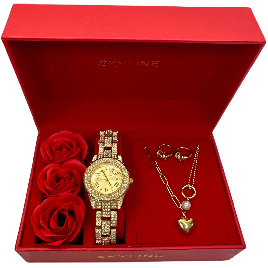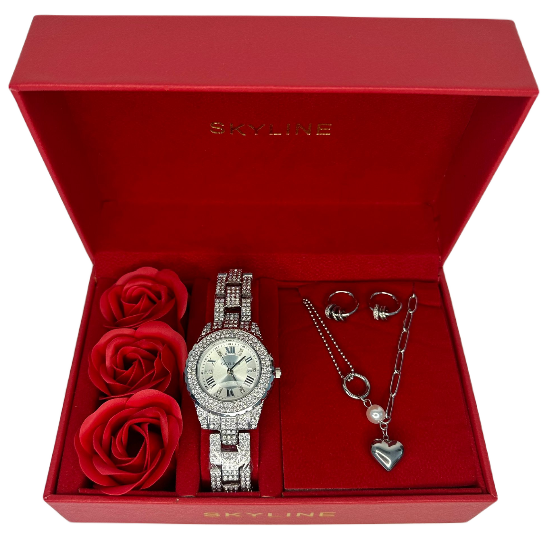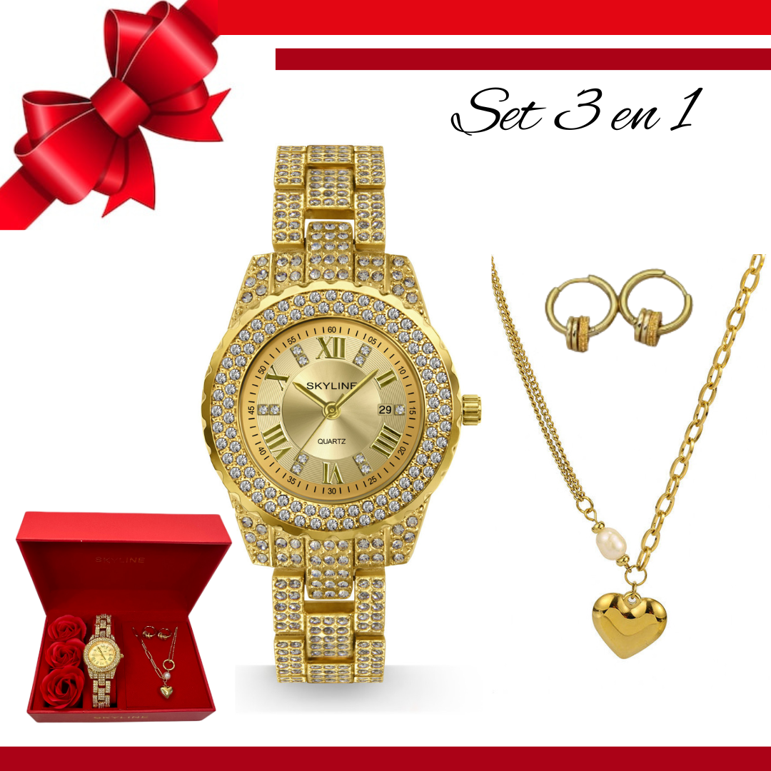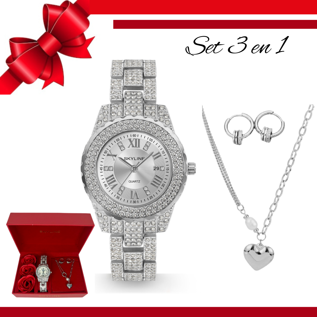 Reloj Acero inoxidable, 1 Collar mas pendientes set 3 en 1 acero inoxidable, Mas Caja Premium Con Rosas